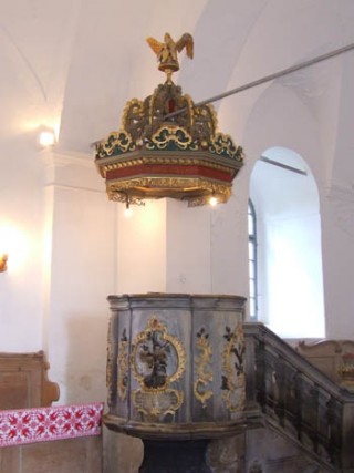 A szószék nem megszokott alaprajzú ,hanem talpas pohárformára emlékeztet. A kőből faragott szószék dísze hímeskőnek nevezhető. A szószék feletti korona (hangvető) fából készült, színesre van festve. A korona csúcsdíszeként a református egyházak jelvényét, a pelikán madarat tették. A szószéki felvezetőlépcső korlátja kőből faragott elemekből készült. A báró Kemény család várkastélya közelében álló templom, még ha a főútról nem is látható, szép és impozáns helyen áll és belső kiképzésénél fogva annak a vidéknek késő barokk, a rokokónak ritka szép művészi alkotása.